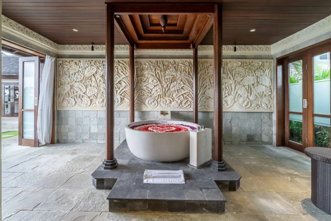 Next to the infinity pool, this one’s for those who like to be in the thick of it. High ceilings, natural light, and an open-air garden bathroom — it’s as social or as sneaky as you want it to be.