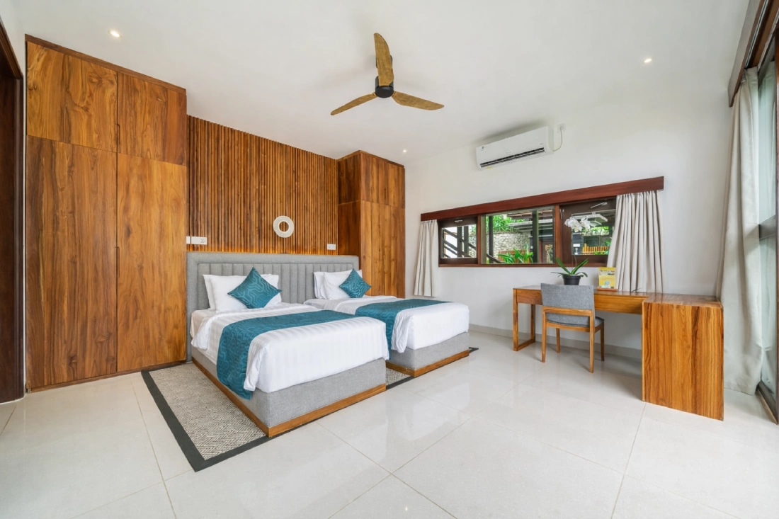 Close to the pool and elegantly designed, this room blends modern sophistication with a sense of ease. Two single beds, refined décor, and a beautifully appointed bathroom create a calm, polished retreat for guests who appreciate quiet luxury and comfort.