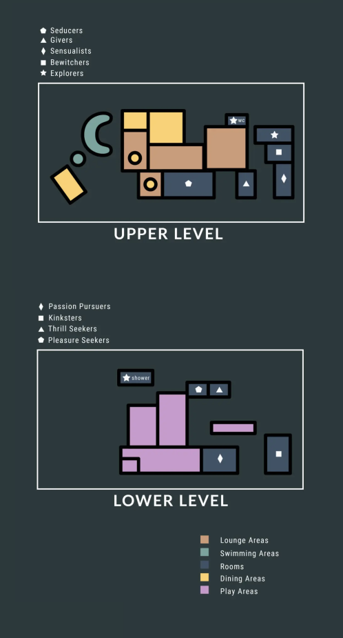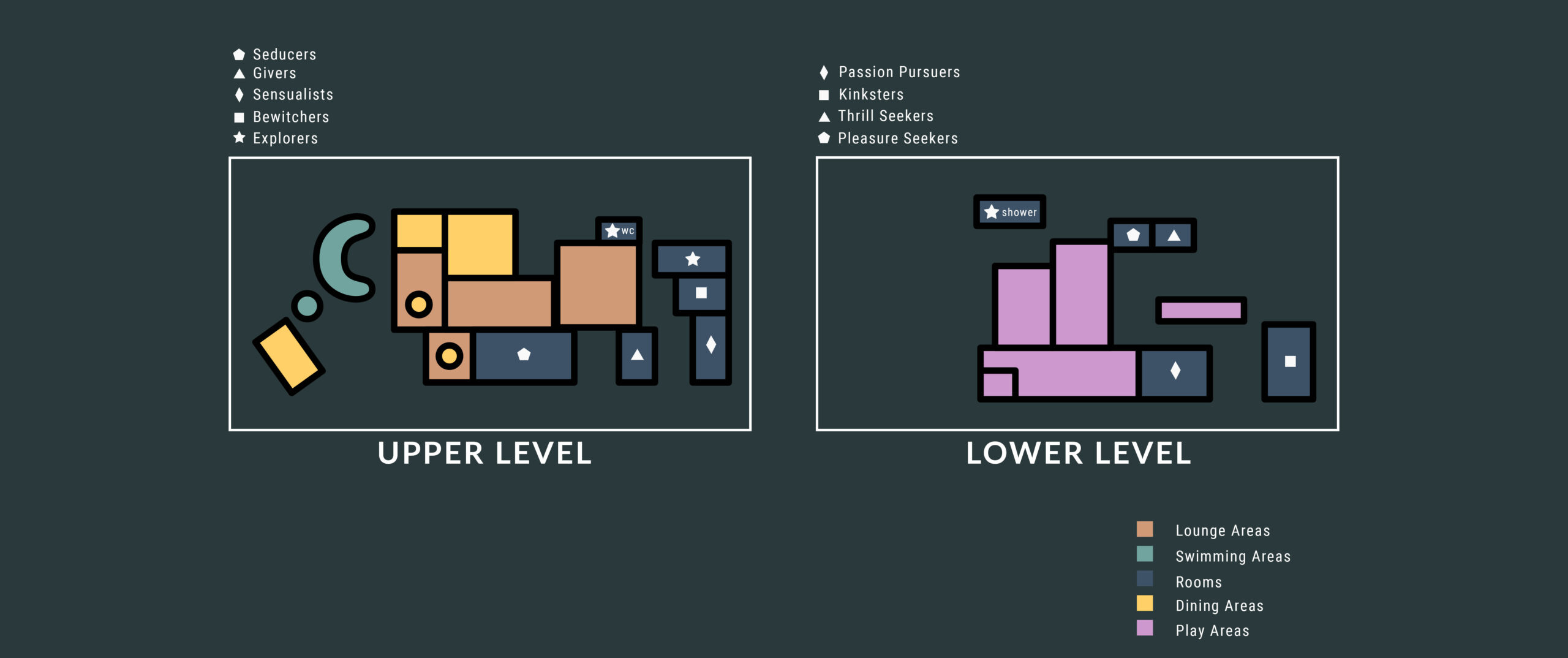 Rooms are named after some Love Languages for Intimacy. How can we describe these rooms? Wait – how do we even start to define the names for these rooms? The villa’s about having fun, so we took a playful turn, and focused on the actual room names… with a sexy overlay, just for kicks…