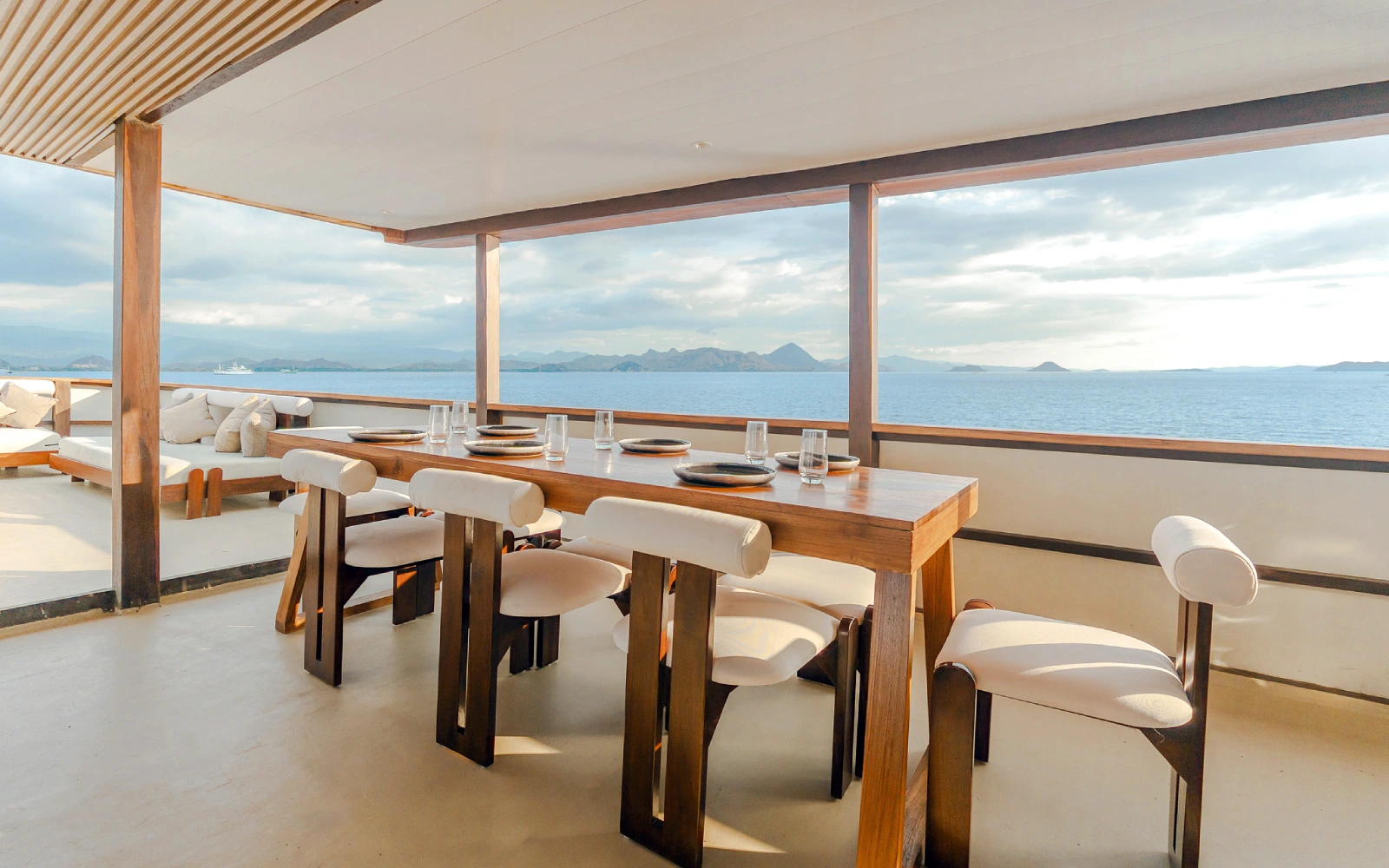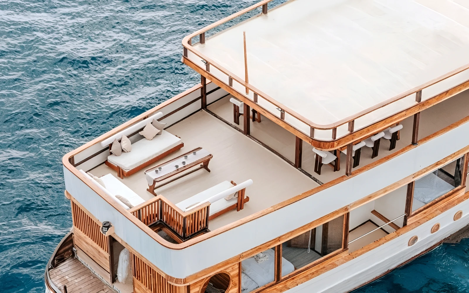 Above, open-air deck space offers wide ocean views and room to stretch, sit, talk, or simply drift. Mornings unfold slowly, afternoons pass easily between swims and conversations, and evenings gather the group together under the stars. This is a boat designed for presence — relaxed, social, and quietly immersive.