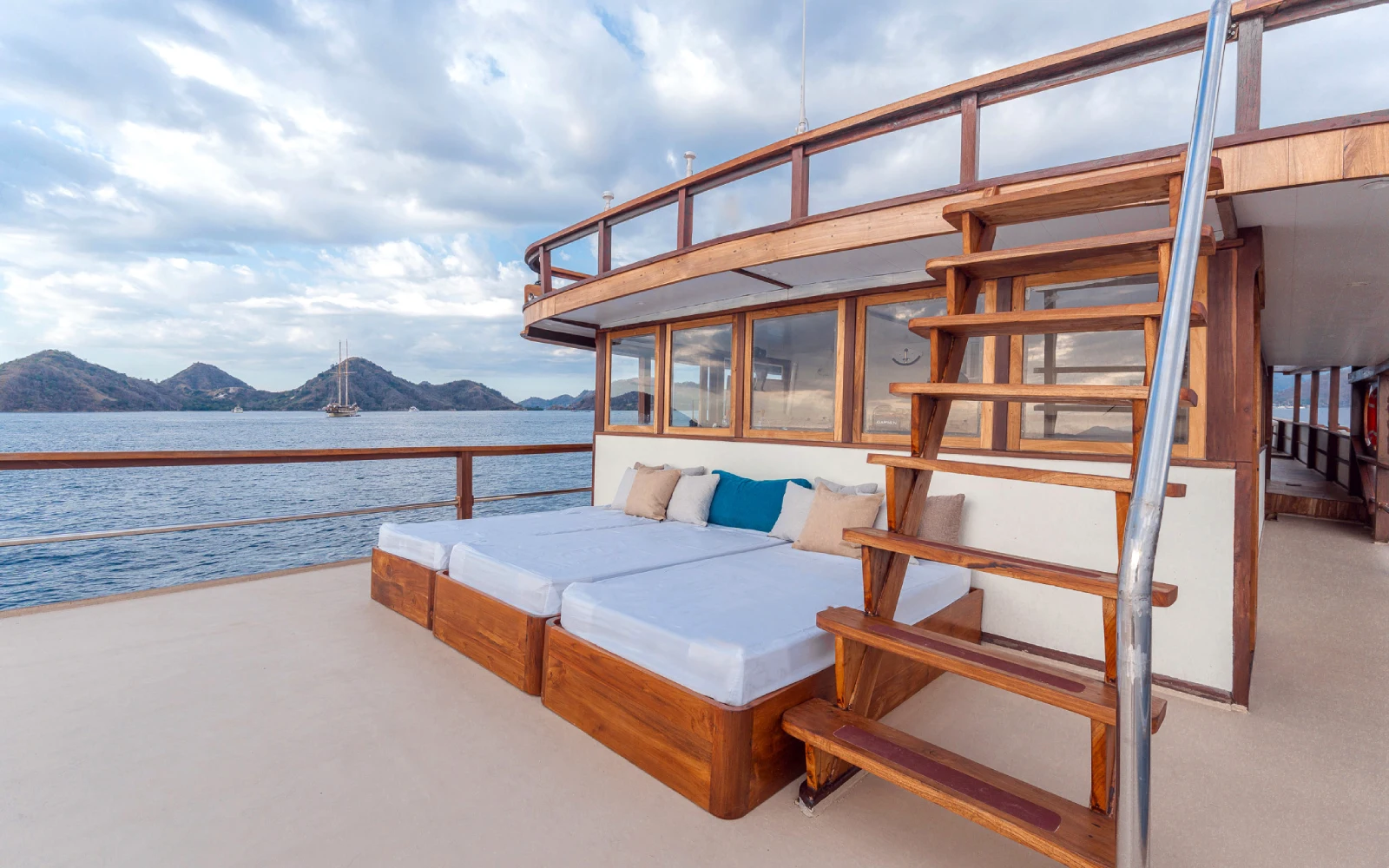 Life onboard The Naked Komodo Sail centers around shared space and time together. Built in 2025, the yacht features clean lines, light wood, and a contemporary minimalist aesthetic — designed to keep the focus on connection rather than retreat. Multiple open decks create a natural flow throughout the day: shaded areas for lounging, sunlit spaces for stretching out, and quiet corners when you want a moment to yourself.