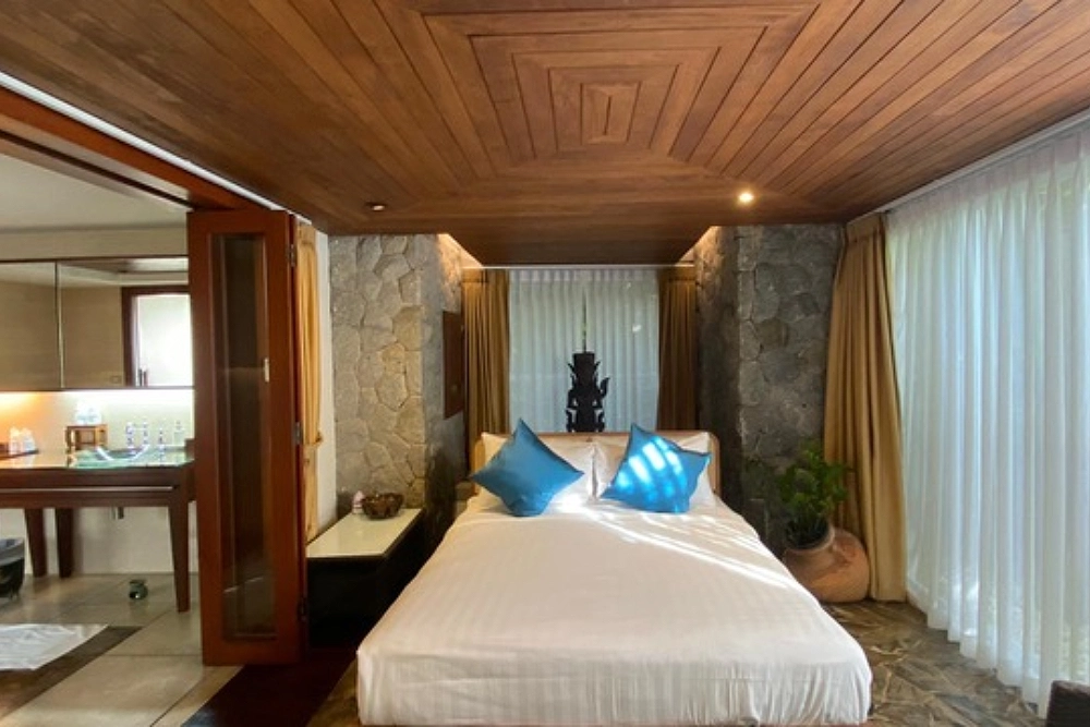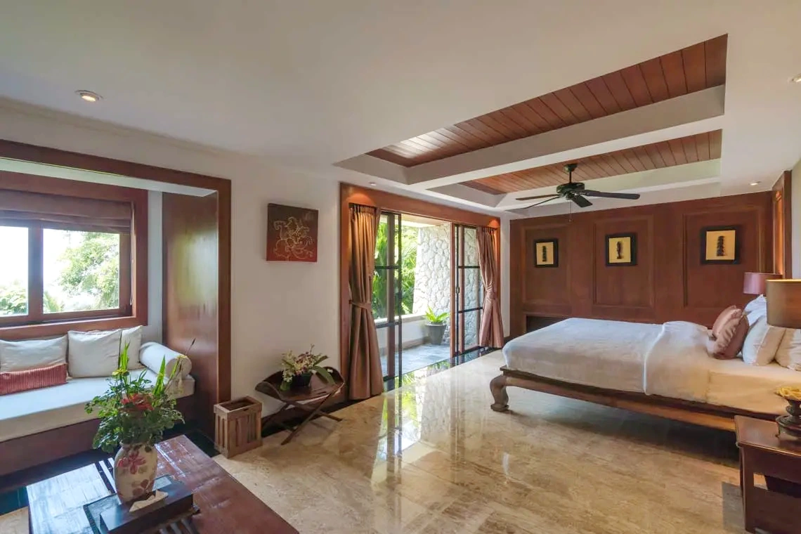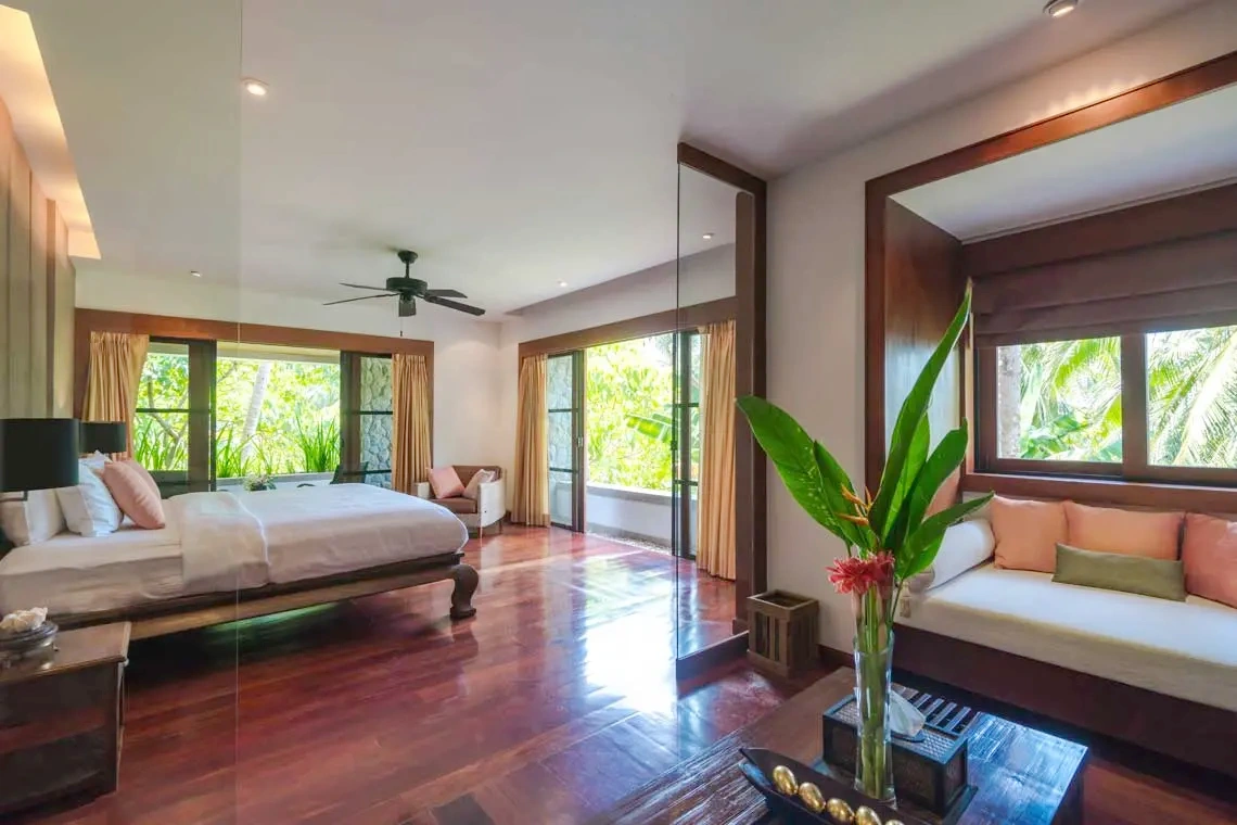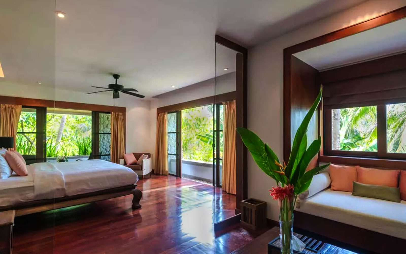 Split-level and stacked with beds — king bed, single beds, even a smaller 90cm x 182cm Javanese “wedding” bed — this room is the life of the villa. Wet bar, couch, garden view… it’s saying let’s not sleep alone tonight.