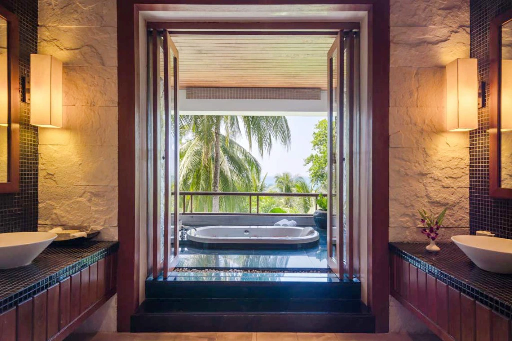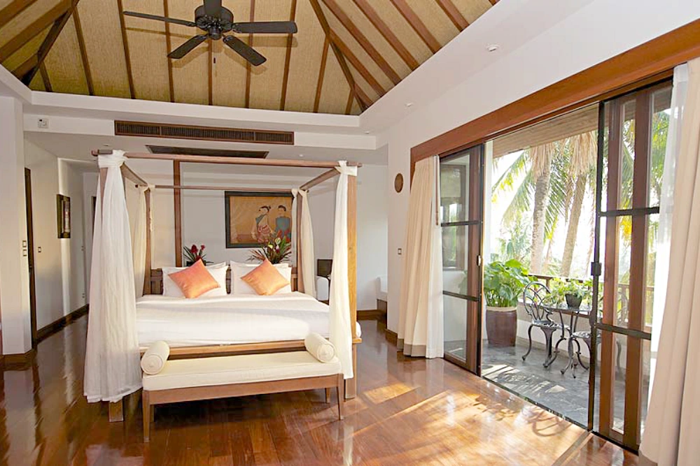 High in the lush hills above Surin Beach, the villa is pure tropical indulgence — an escape that blends Thai elegance with Everything To Sea ease. Its steeply sloping roofs and open-air design fit naturally among orchids, palms, and sweeping sea views. At its heart, a gorgeous infinity pool shimmers in the sun, fed by a trickling stream of water and anchored by a stone-seated swim-up bar. A shady pavilion nearby holds a revolving table with sunken seating — the perfect spot for long lunches, laughter, and a touch of flirtation.
