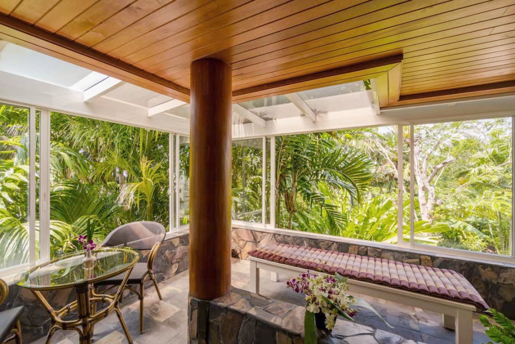 You like your peace and your privacy — this one’s for you. Tucked behind another room, with stone walls, and leafy views, this is your solo sanctuary (just be cool with the shared bath you’ll have to go through to access this room).