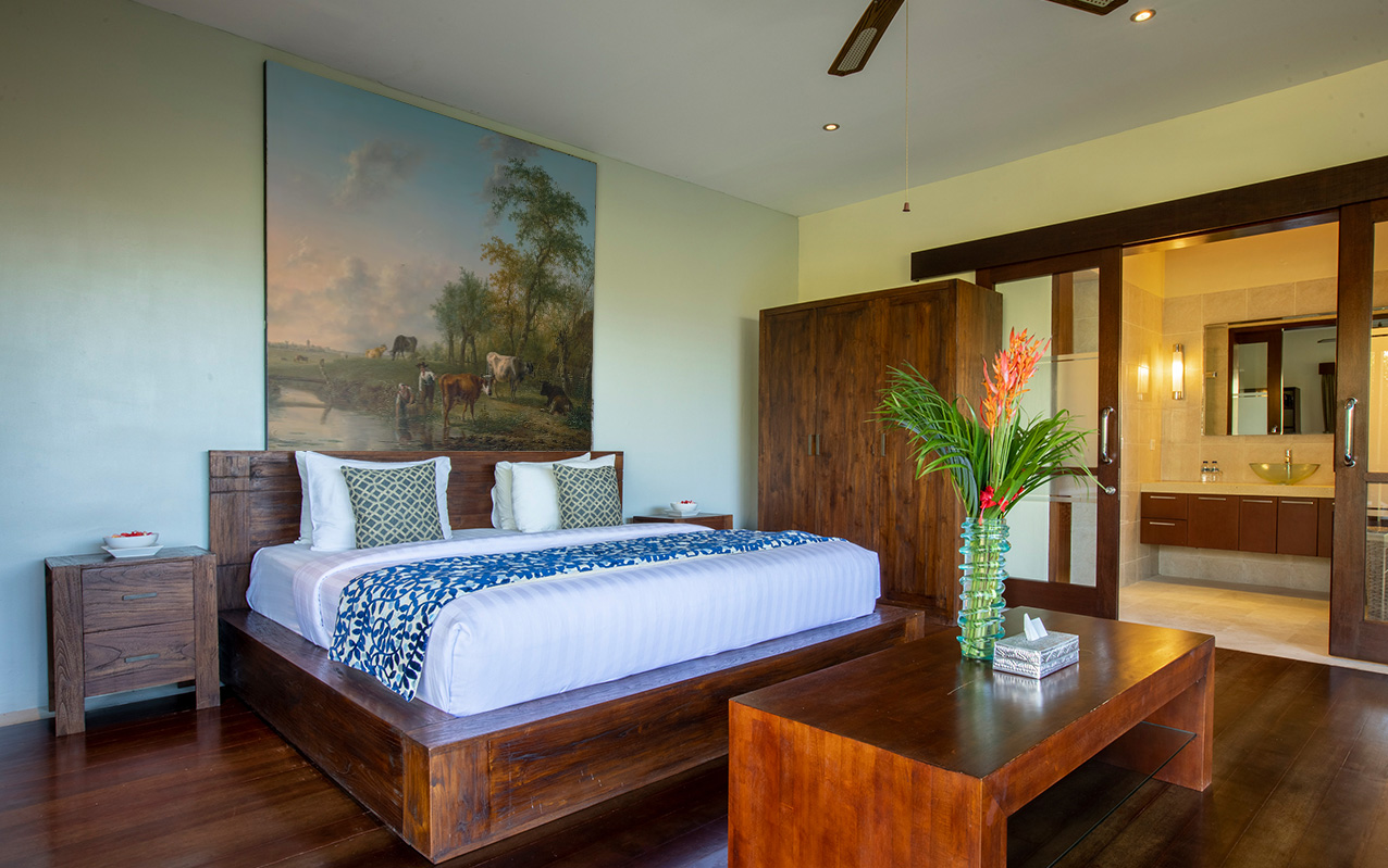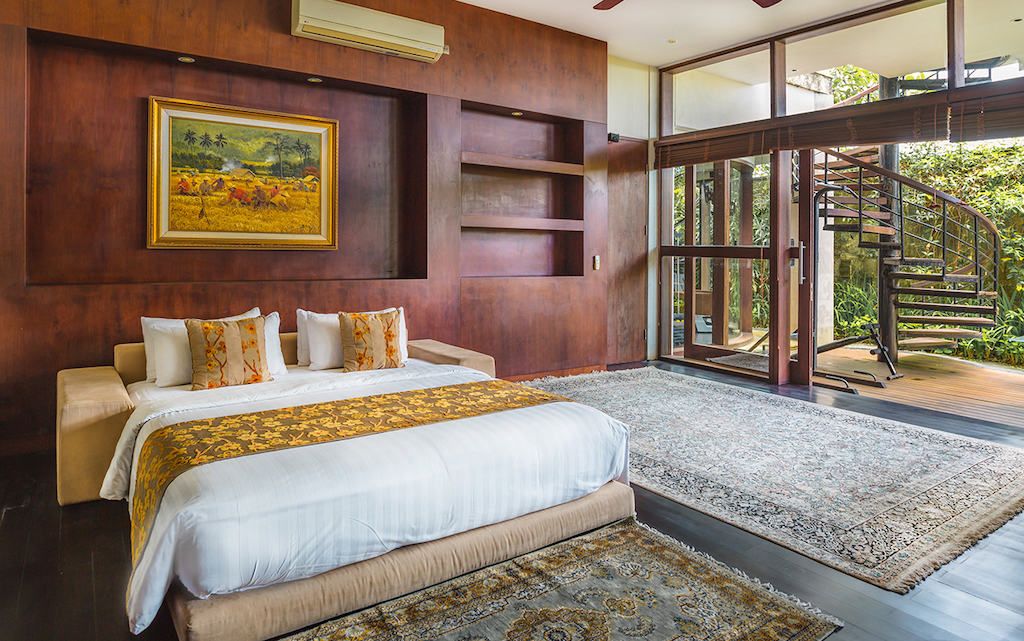 The Abundance Room is in the middle section of the villa, situated at the end of a beautiful flower garden path. It’s adjacent to the villa gym, and faces a spiral staircase that leads to the above level deck, as well as a few stairs that lead down to other rooms. With a simple bathroom and furnishings, it’s open and spacious – a comfortable choice for any guest.