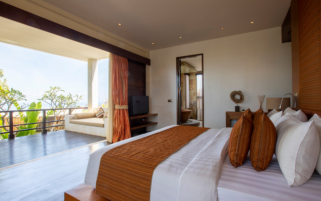 The Radiance Room is the topmost room in the stepped-villa complex, and overlooks the blue ocean. The sliding glass doors open to a private deck, including a plush daybed and private outdoor pavilion. It’s the perfect room for those who appreciate a balance of activity and quiet time.