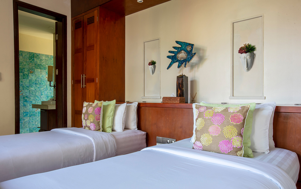 The Imagination Room is situated next to the infinity pool, perfect for sociable fellows that like to be close to the action. The room features two single beds, plenty of storage space, and an ocean-themed bathroom. This room may accommodate a third single bed, and is therefore a great choice for friends who want to be together, but not sleep in the same beds.