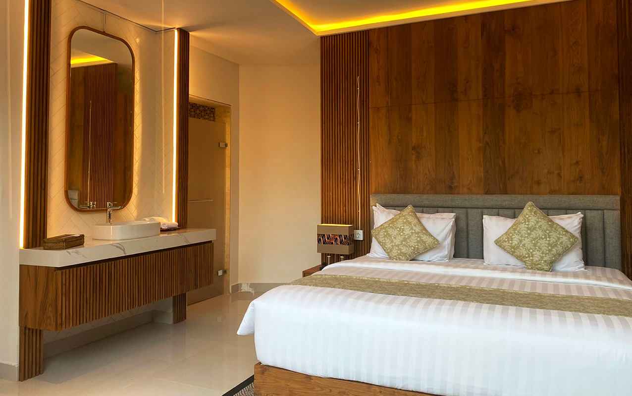 The Brilliance Room is decorated with wood carvings and artwork, for an authentic feel. Natural light streams in from multiple directions, as the bed faces an ocean view that spans nearly 90 degrees. Easy access to social areas such as the infinity pool, which is set off to the side. A great fit for those who want an upscale room that’s still close to the action.